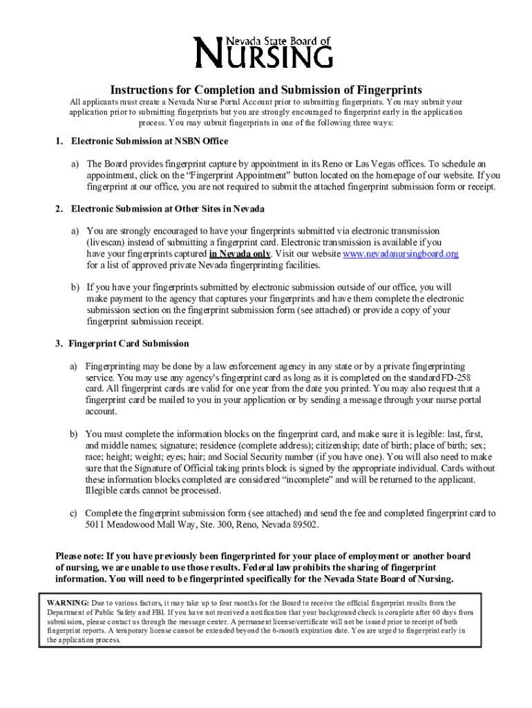 Instructions for Completion and Submission of Fingerprints applicants must create a Nevada Nurse Portal Account prior to submitting fingerprints. You may submit your application prior to submitting