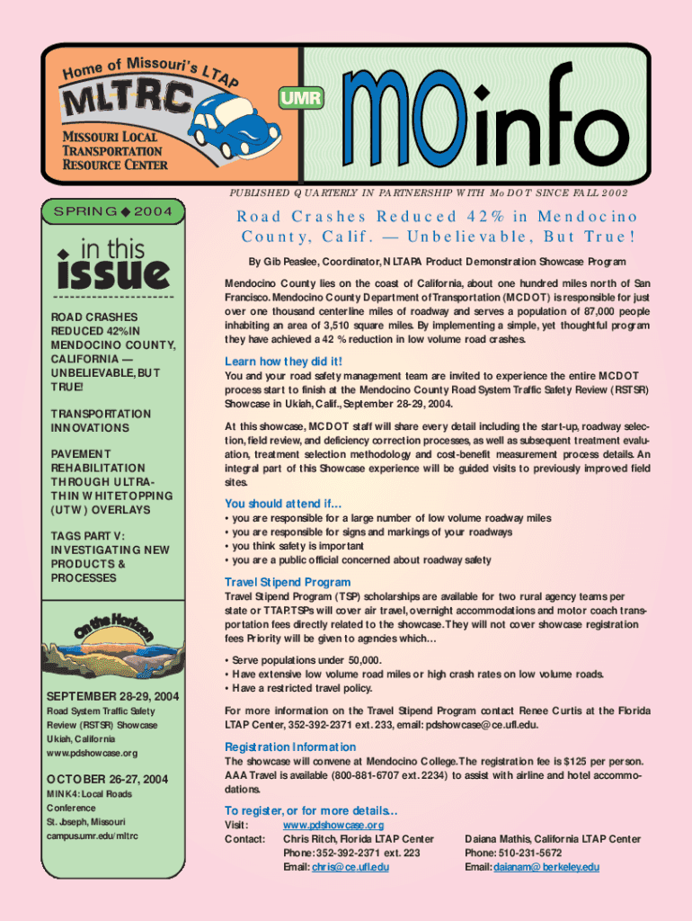PUBLISHED QUARTERLY IN PARTNERSHIP WITH Moot SINCE FALL 2002 SPRING20 04Road Crashes Reduced 42% in Mendocino County, Calif. Unbelievable, But True! By GIB Peas lee, Coordinator, NAPA Product Demonstration