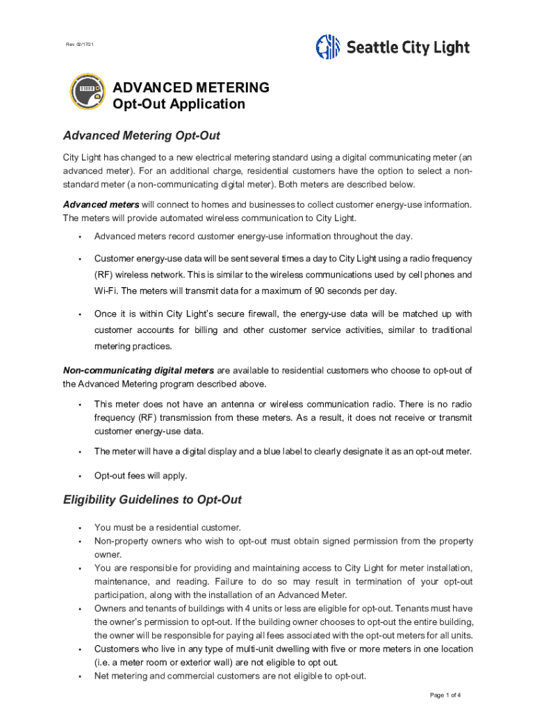 Rev. 02/17/21ADVANCED METERING Opt-out Application Advanced Metering Opt-out City Light has changed to a new electrical metering standard using a digital communicating meter (an advanced meter). For