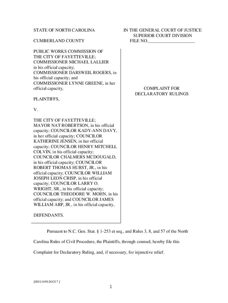 STATE OF NORTH CAROLINA THE GENERAL COURT OF JUSTICE SUPERIOR COURT DIVISION FILE NO. CUMBERLAND COUNTY PUBLIC WORKS COMMISSION OF THE CITY OF FAYETTEVILLE; COMMISSIONER MICHAEL DALLIER in his official