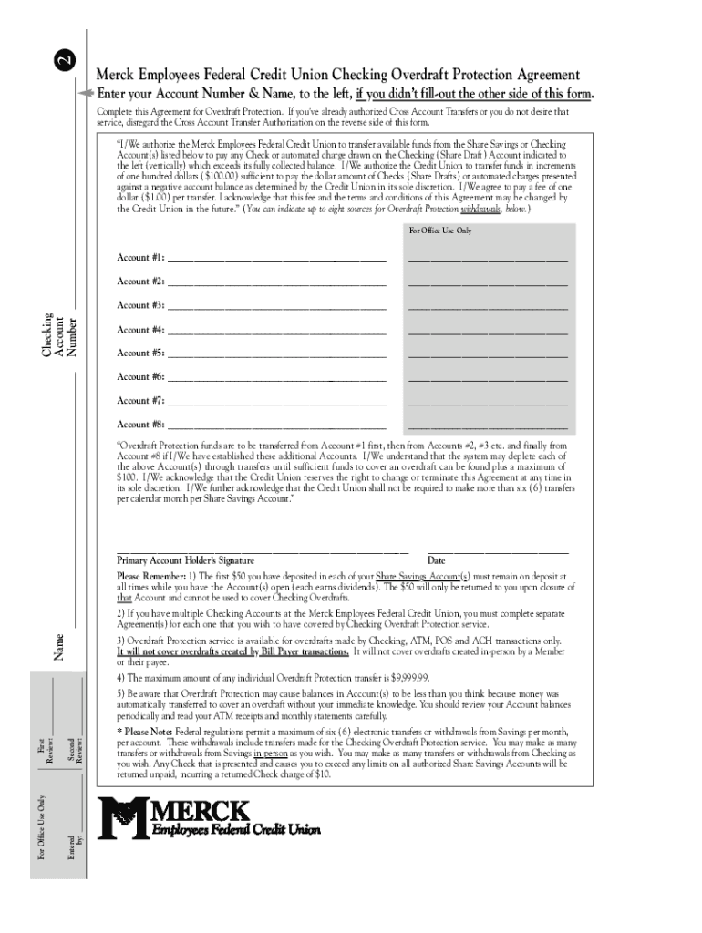 2 Merck Employees Federal Credit Union Checking Overdraft Protection Agreement Enter your Account Number & Name, to the left, if you didn't fall out the other side of this form. Complete this Agreement