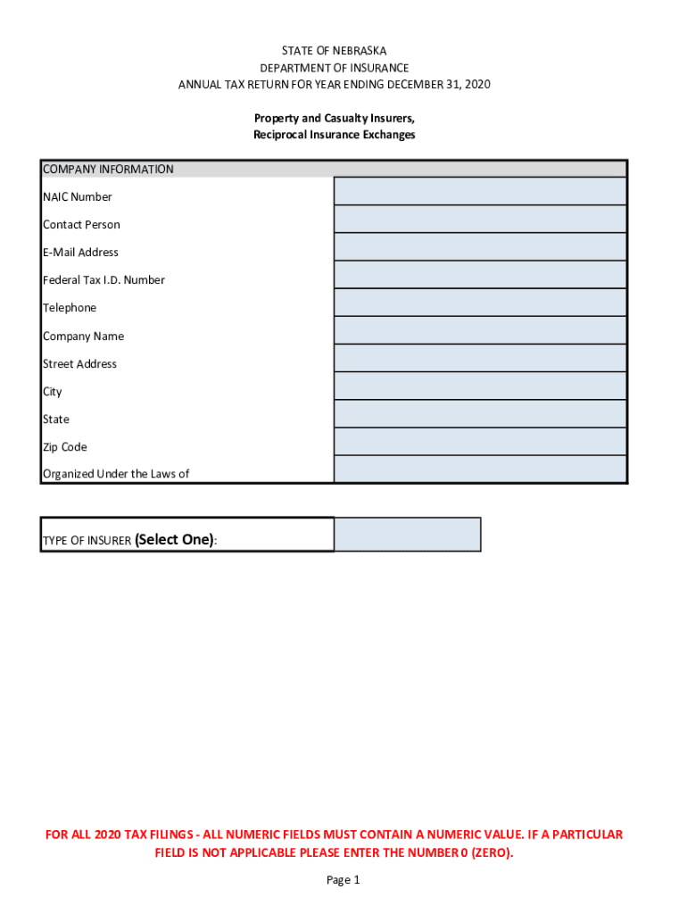 STATE OF NEBRASKA DEPARTMENT OF INSURANCE ANNUAL TAX RETURN FOR YEAR ENDING DECEMBER 31, 2020, Property and Casualty Insurers, Reciprocal Insurance Exchanges COMPANY INFORMATION NAIL Number Contact