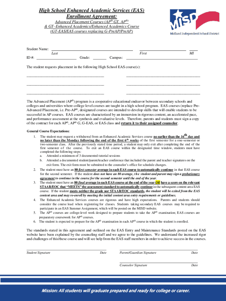 High School Enhanced Academic Services (EAS) Enrollment Agreement: Advanced Placement Courses (AP GT, AP) & Enhanced Academics/Enhanced Academics Course (TEAS/EAS courses replacing Great/Prep) Student