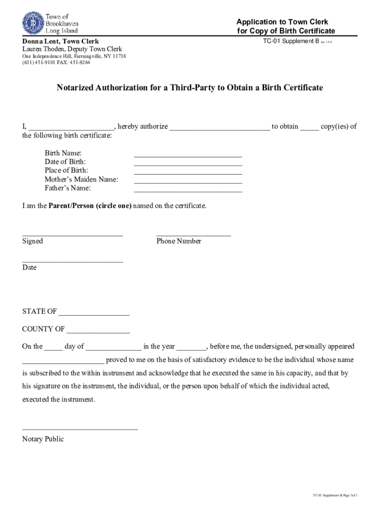 Application to Town Clerk for Copy of Birth Certificate Donna Lent, Town Clerk Lauren Tho den, Deputy Town ClerkTC01 Supplement B rev. 1/14One Independence Hill, Farmville, NY 11738 (631) 4519101