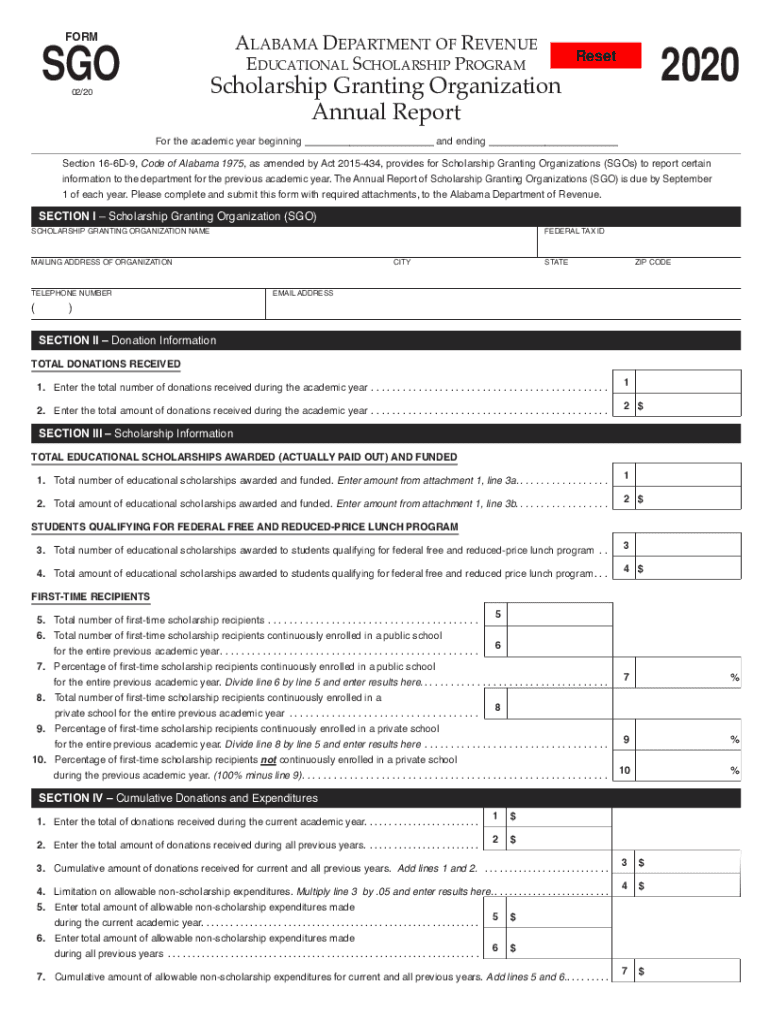 ALABAMA DEPARTMENT OF REVENUEFORMSGOEDUCATIONAL SCHOLARSHIP PROGRAM2020ResetScholarship Granting Organization Annual Report02/20For the academic year beginning and ending Section 166D9, Code of Alabama