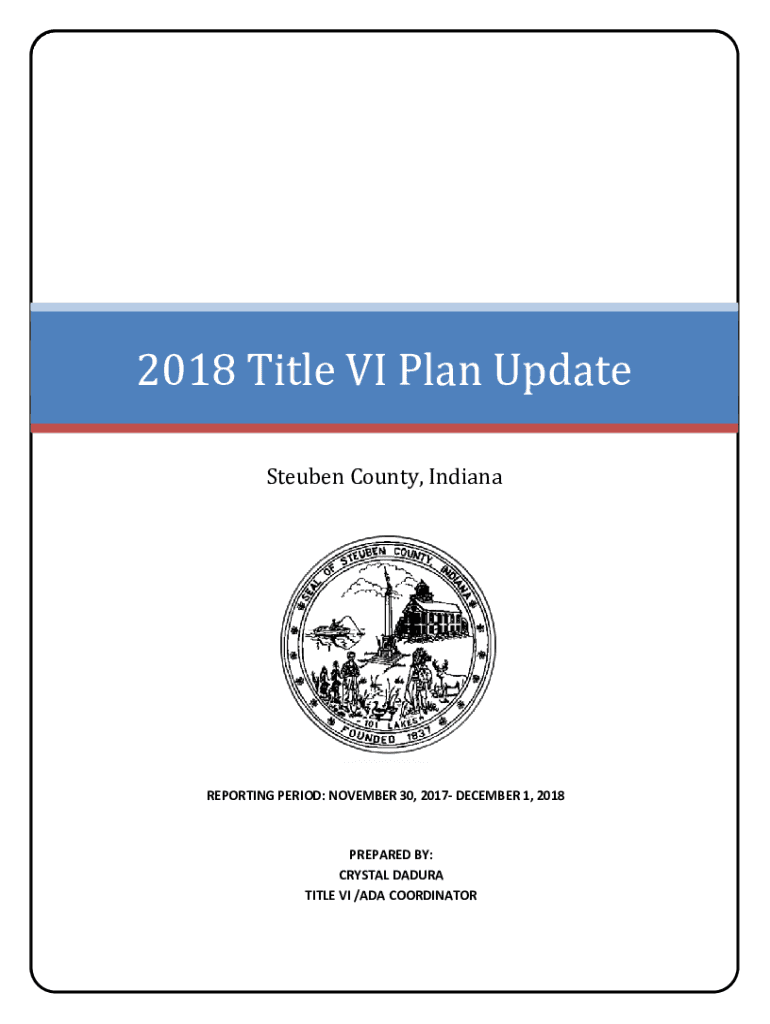 2018 Title VI Plan Update Steuben County, IndianaREPORTING PERIOD: NOVEMBER 30, 2017, DECEMBER 1, 2018PREPARED BY: CRYSTAL DAD URA TITLE VI /ADA COORDINATOR2018 Title VI Plan Updatable of Contents