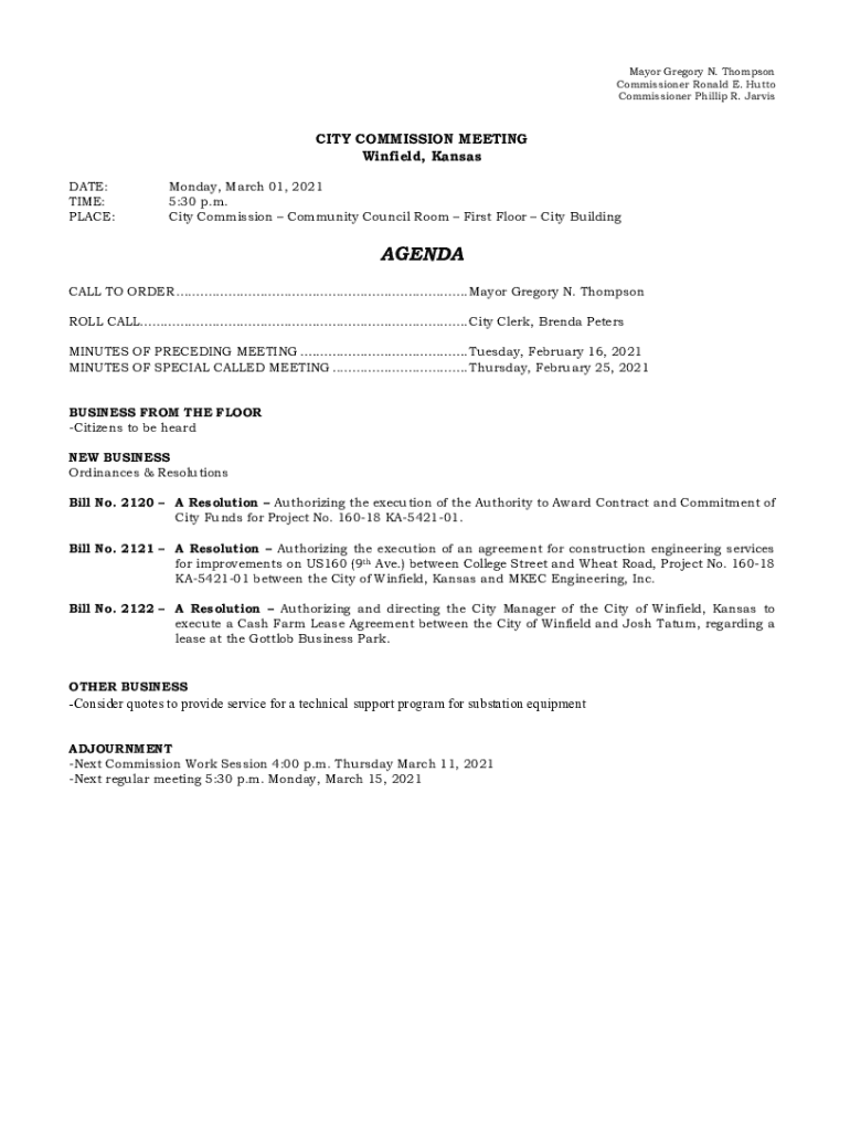 Mayor Gregory N. Thompson Commissioner Ronald E. Bhutto Commissioner Phillip R. JarvisCITY COMMISSION MEETING Winfield, Kansas DATE: TIME: PLACE:Monday, March 01, 2021 5:30 p.m. City Commission Community