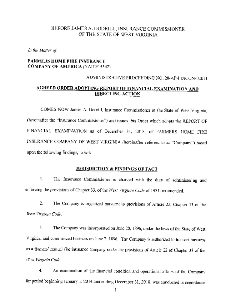 REPORT OF EXAMINATION OF FARMERS HOME FIRE INSURANCE COMPANY OF WEST VIRGINIA LEESBURG, WV NAIL #15342 AS OF DECEMBER 31, 2018West Virginia Offices of the Insurance Commissionable OF CONTENTS SALUTATION