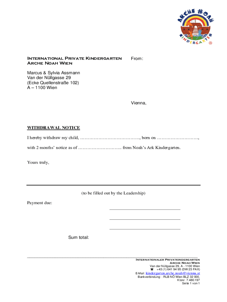 International Private Kindergarten Arch Noah Inform:Marcus & Sylvia Ashman Van her Ligase 29 (Eke Quellenstrae 102) A 1100 WienVienna, WITHDRAWAL NOTICE I hereby withdraw my child, born on, with 2