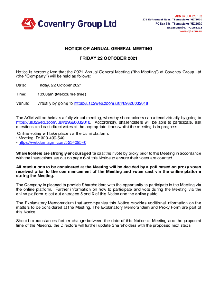 NOTICE OF ANNUAL GENERAL MEETING FRIDAY 22 OCTOBER 2021 Notice is hereby given that the 2021 Annual General Meeting (the Meeting) of Coventry Group Ltd (the Company “) will be held as follows: Date:Friday,