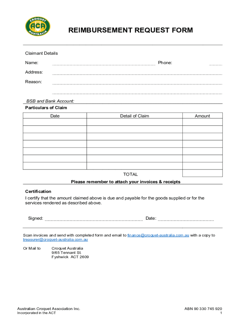REIMBURSEMENT REQUEST FORM Claimant Details Name:Phone:address: Reason:BSB and Bank Account: Particulars of Claim Daredevil of ClaimAmountTOTAL Please remember to attach your invoices & receipts Certification