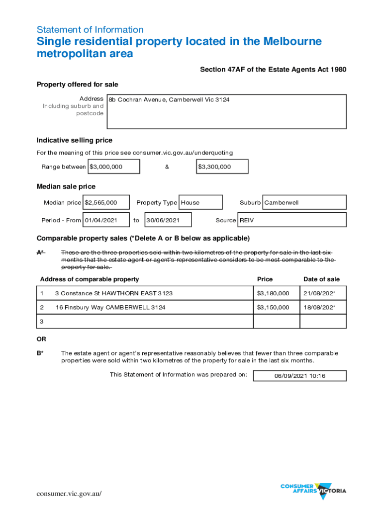 Statement of InformationSingle residential property located in the Melbourne metropolitan area Section 47AF of the Estate Agents Act 1980 Property offered for sale Address 8b Cochran Avenue, Camber