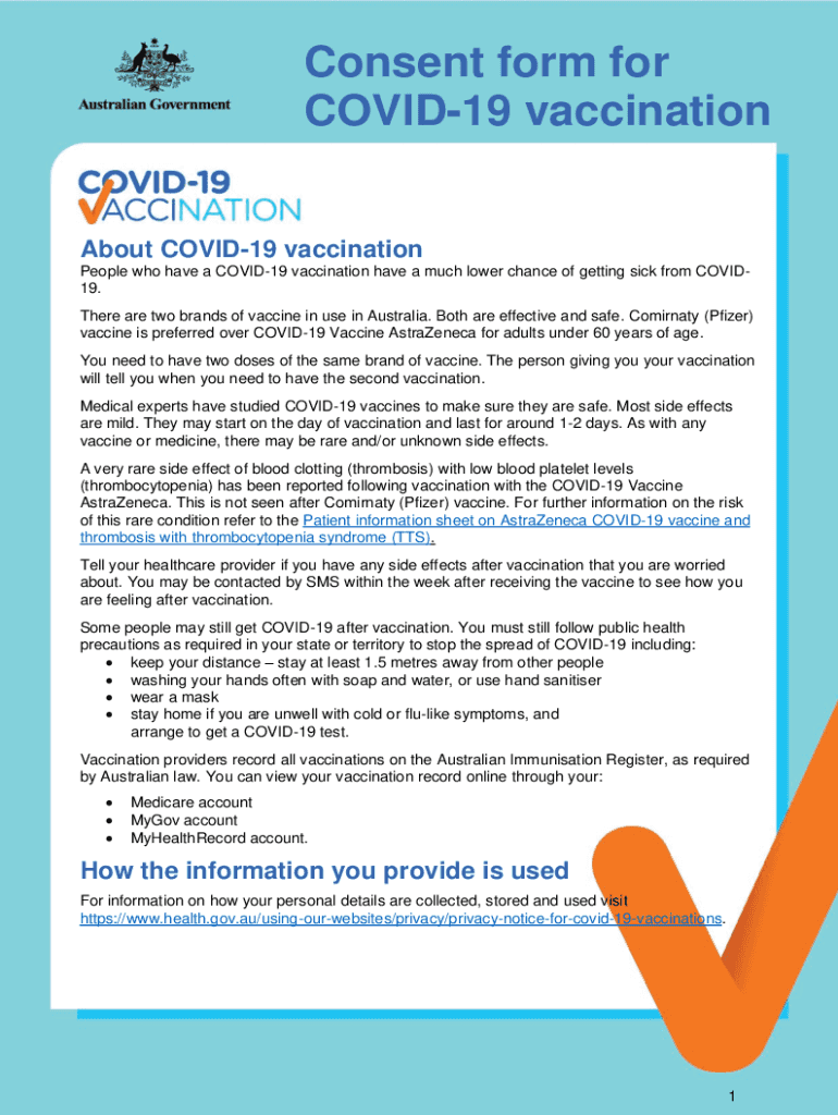 Consent form for COVID-19 vaccination About COVID-19 vaccination People who have a COVID-19 vaccination have a much lower chance of getting sick from COVID-19. There are two brands of vaccine in use