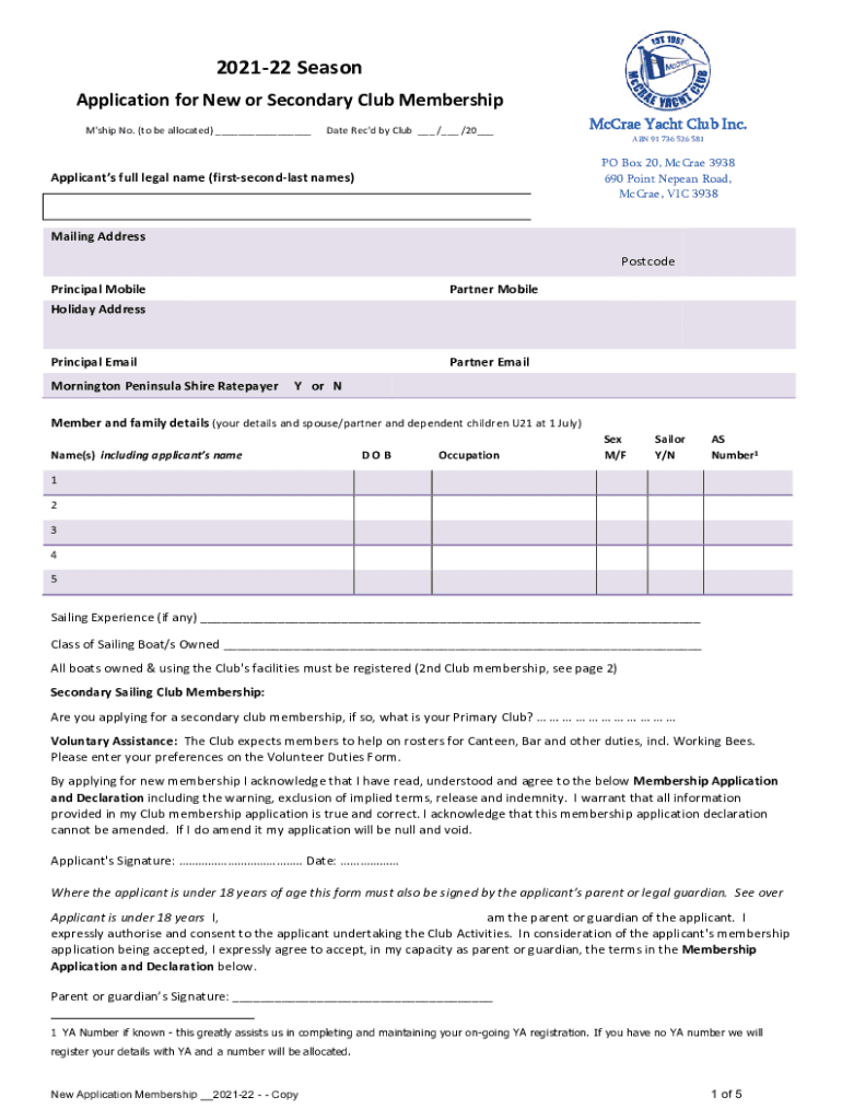 Get the free New Member Application Forms 2019-20 - McCrae Yacht Club