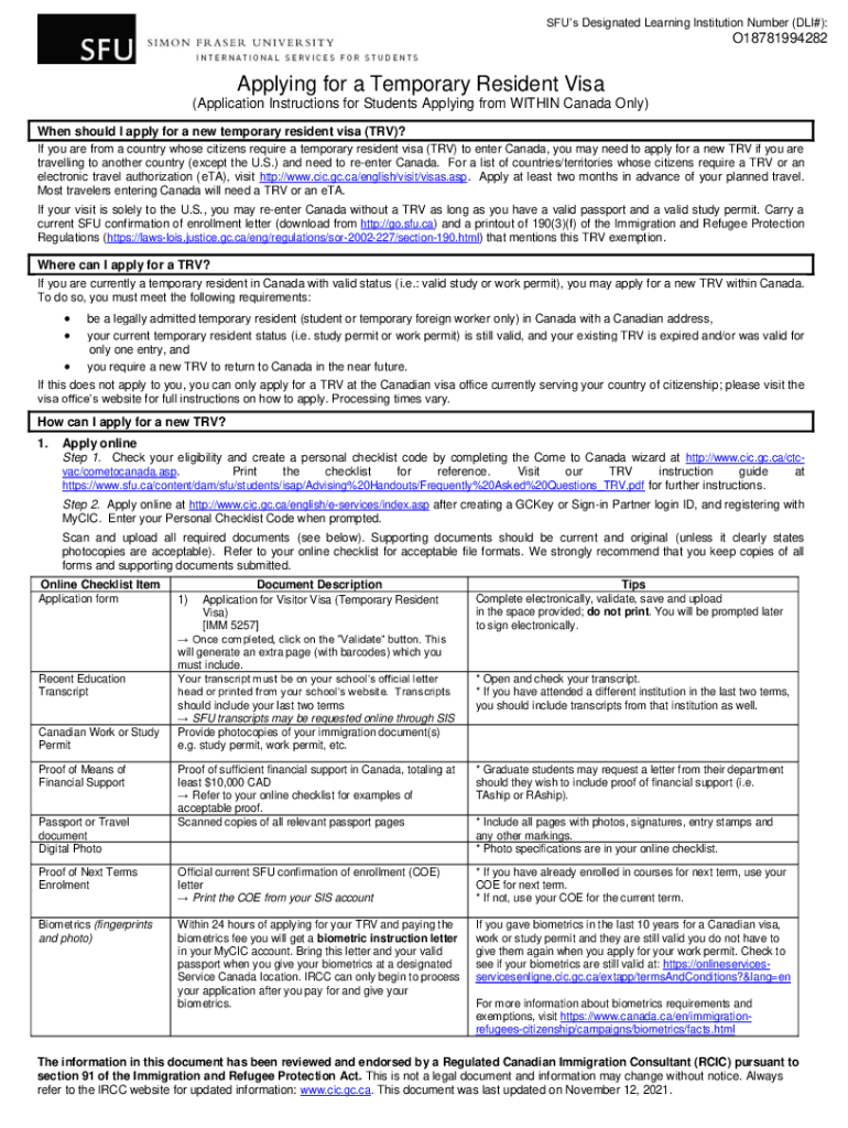 To fill out the Canada SFU Application for a Temporary Resident Visa, applicants must complete the appropriate forms available online, ensure they provide accurate personal information, attach required documents, and pay the processing fee.