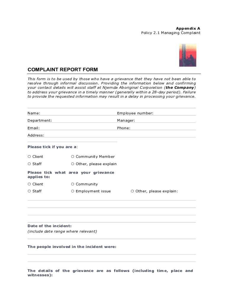 Appendix A Policy 2.1 Managing ComplaintCOMPLAINT REPORT From This form is to be used by those who have a grievance that they have not been able to resolve through informal discussion. Providing the