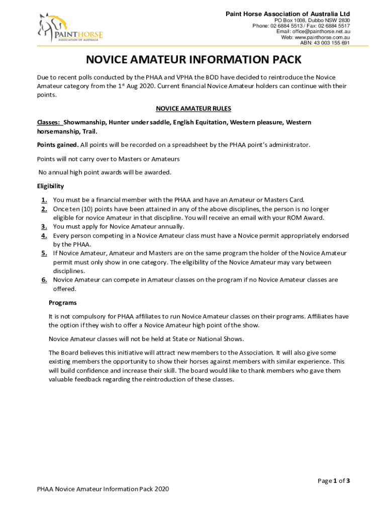 Paint Horse Association of Australia Ltd PO Box 1008, Dumbo NSW 2830 Phone: 02 6884 5513 / Fax: 02 6884 5517 Email: office@painthorse.net.au Web: www.painthorse.com.au ABN: 43 003 155 691NOVICE AMATEUR