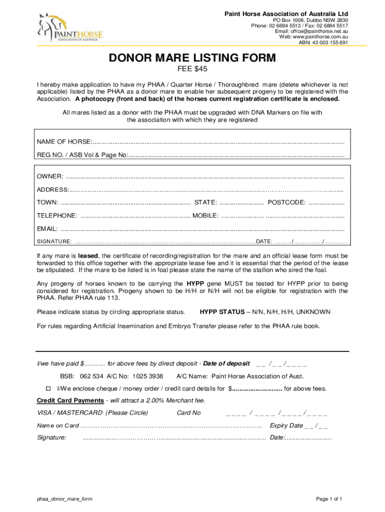 Get the free AQHA-ASB Mare Listing Form. PHAA mare listing form