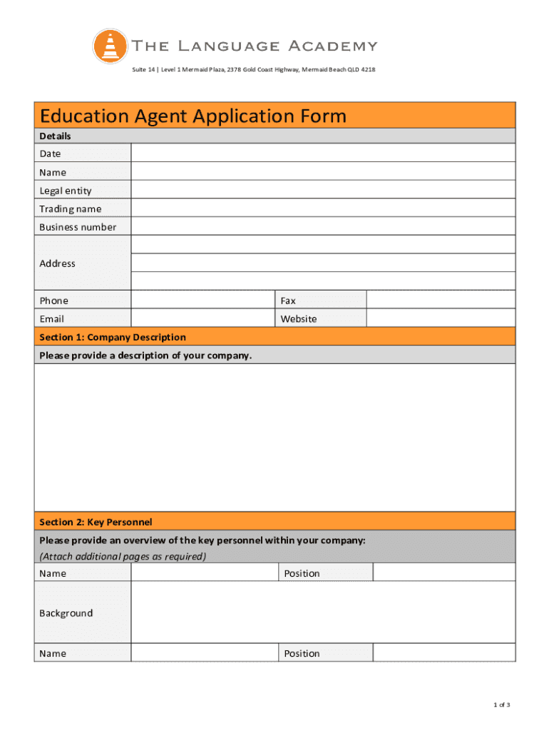Suite 14 Level 1 Mermaid Plaza, 2378 Gold Coast Highway, Mermaid Beach QLD 4218Education Agent Application Form Details Date Name Legal entity Trading name Business number Address PhoneFaxEmailWebsiteSection