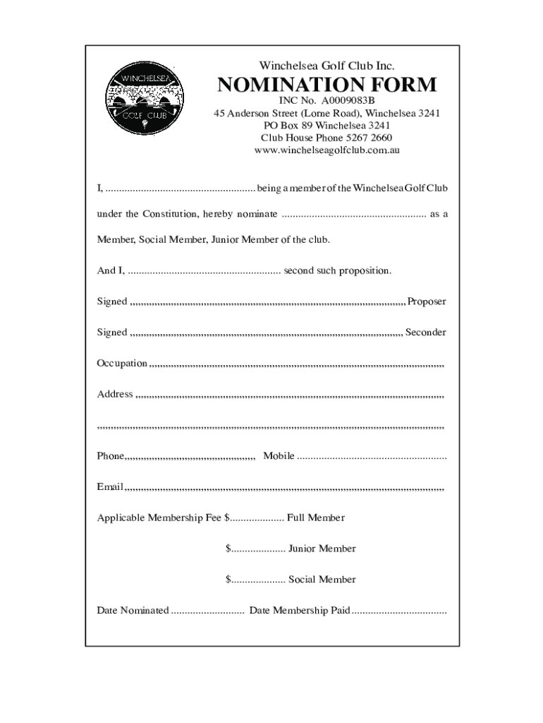 Winchelsea Golf Club Inc. NOMINATION FORMING No. A0009083B 45 Anderson Street (Borne Road), Winchelsea 3241 PO Box 89 Winchelsea 3241 Club House Phone 5267 2660 www.winchelseagolfclub.com.au I, .......................................................