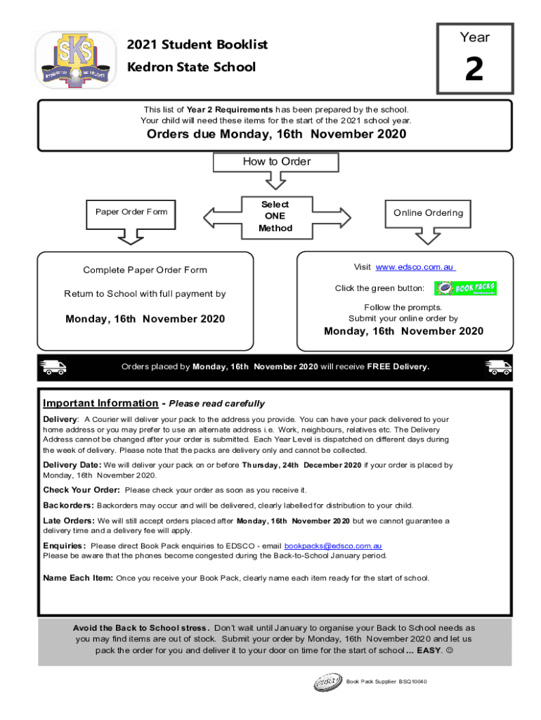 Insert School Logo HereYear2021 Student Booklist2Kedron State School This list of Year 2 Requirements has been prepared by the school. Your child will need these items for the start of the 2021 school