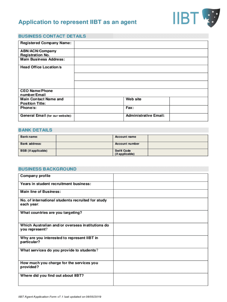 Application to represent IIT as an agent BUSINESS CONTACT DETAILS Registered Company Name: ABN/ACN/Company Registration No. Main Business Address: Head Office Location/CEO Name/Phone number/Email