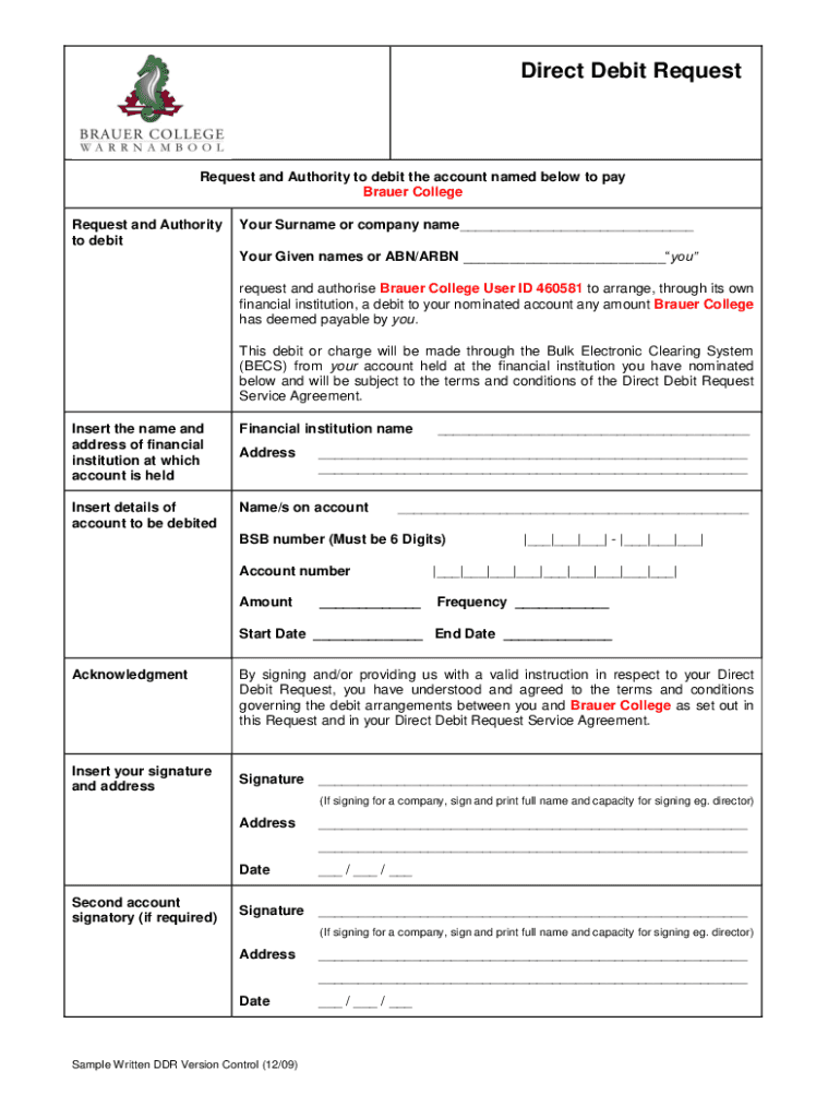 Direct Debit RequestRequest and Authority to debit the account named below to pay Bauer College Request and Authority to debtor Surname or company name Your Given names or ABN/ARON you request and