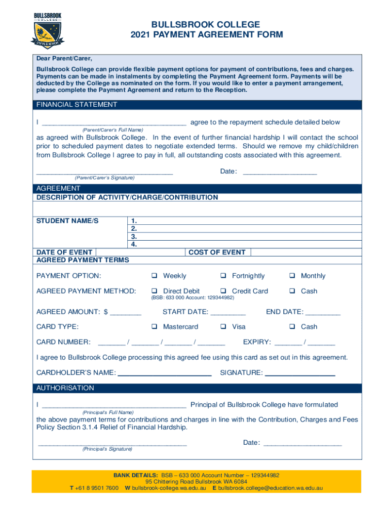 Get the free BULLSBROOK COLLEGE 2021 PAYMENT AGREEMENT FORM - bullsbrook-college wa edu