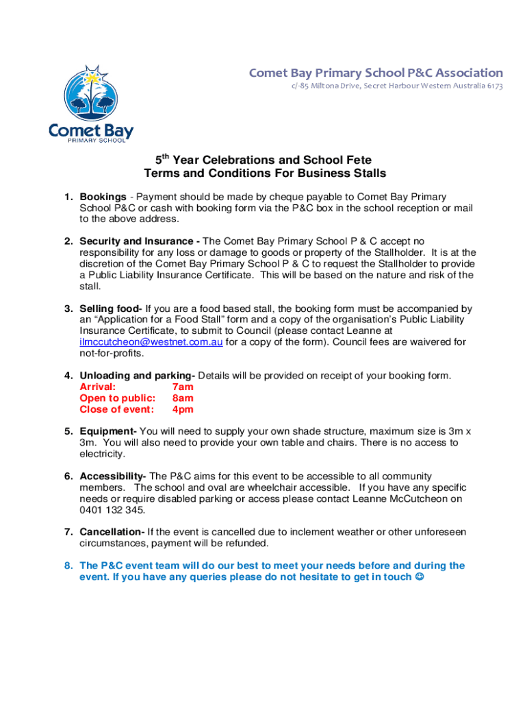 CometBayPrimarySchoolP&CAssociation c/85MiltonaDrive,SecretHarbourWesternAustralia61735th Year Celebrations and School F the Terms and Conditions For Business Stalls 1. Bookings Payment should be