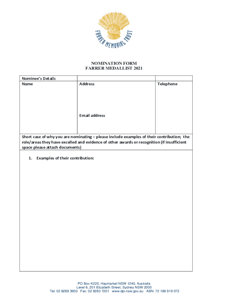 The nomination form for the Farrer Medallist is an official document used to nominate candidates for the prestigious Farrer Medal, awarded for significant contributions in the field of agriculture.