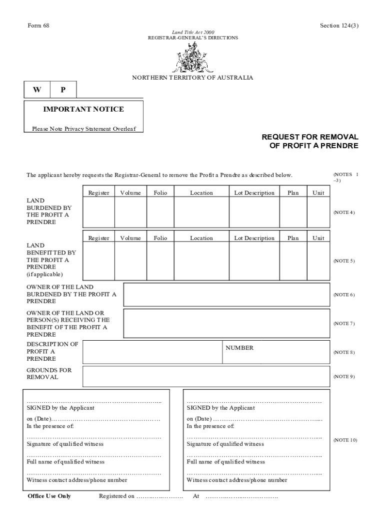Form 68Section 124(3)Land Title Act 2000 REGISTRARGENERALS DIRECTIONSNORTHERN TERRITORY OF AUSTRALIA IMPORTANT NOTICEPlease Note Privacy Statement OverleafREQUEST FOR REMOVAL OF PROFIT A PRENDREThe