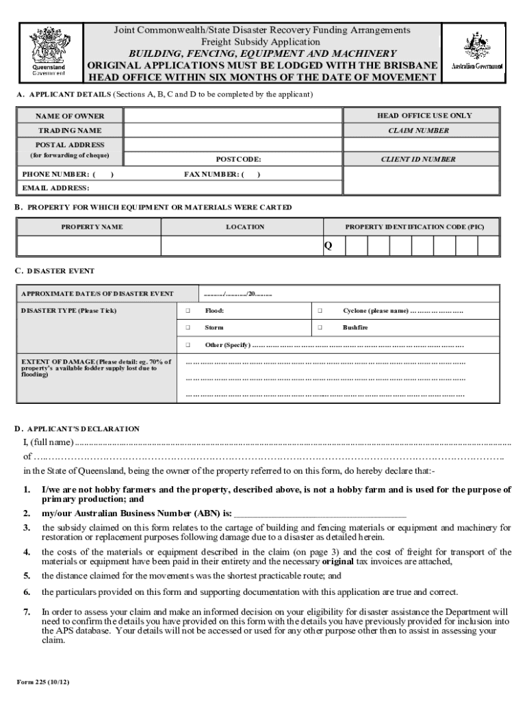 Joint Commonwealth/State Disaster Recovery Funding Arrangements Freight Subsidy Application BUILDING, FENCING, EQUIPMENT AND MACHINERY ORIGINAL APPLICATIONS MUST BE LODGED WITH THE BRISBANE HEAD OFFICE
