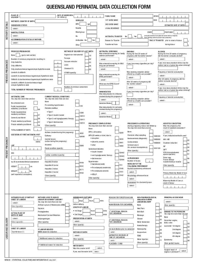 QUEENSLAND PERINATAL DATA COLLECTION FORM MOTHERS DETAILSPLACE OF DELIBERATE OF ADMISSION (for delivery) SEROLOGYMOTHERS COUNTRY OF BIRTHRPRINDIGENOUS STATUSDOBESTIMATED DATE OF BIRTHUSUAL RESIDENCEBlood