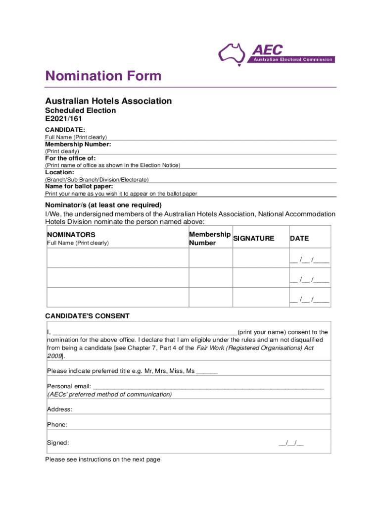 Nomination Form Australian Hotels Association Scheduled Election E2021/161 CANDIDATE: Full Name (Print clearly)Membership Number: (Print clearly)For the office of: (Print name of office as shown in