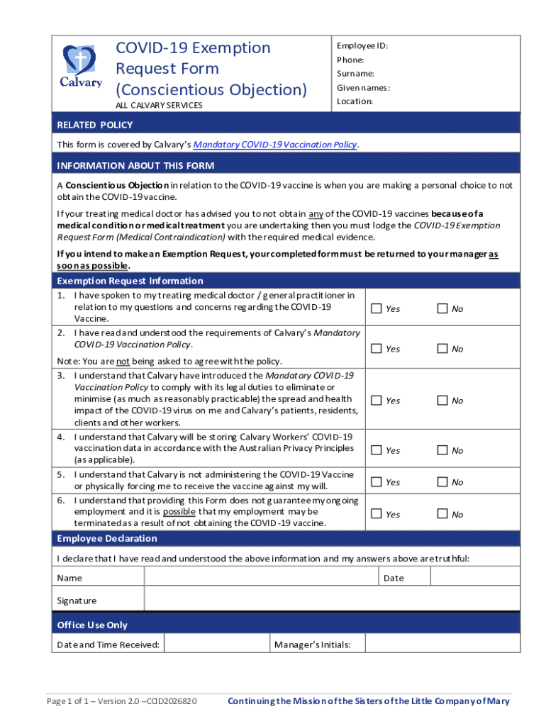 COVID-19 Exemption Request Form (Conscientious Objection) ALL CALVARY SERVICESEmployee ID: Phone: Surname: Given names: Location:RELATED POLICY This form is covered by Calvary's Mandatory COVID-19