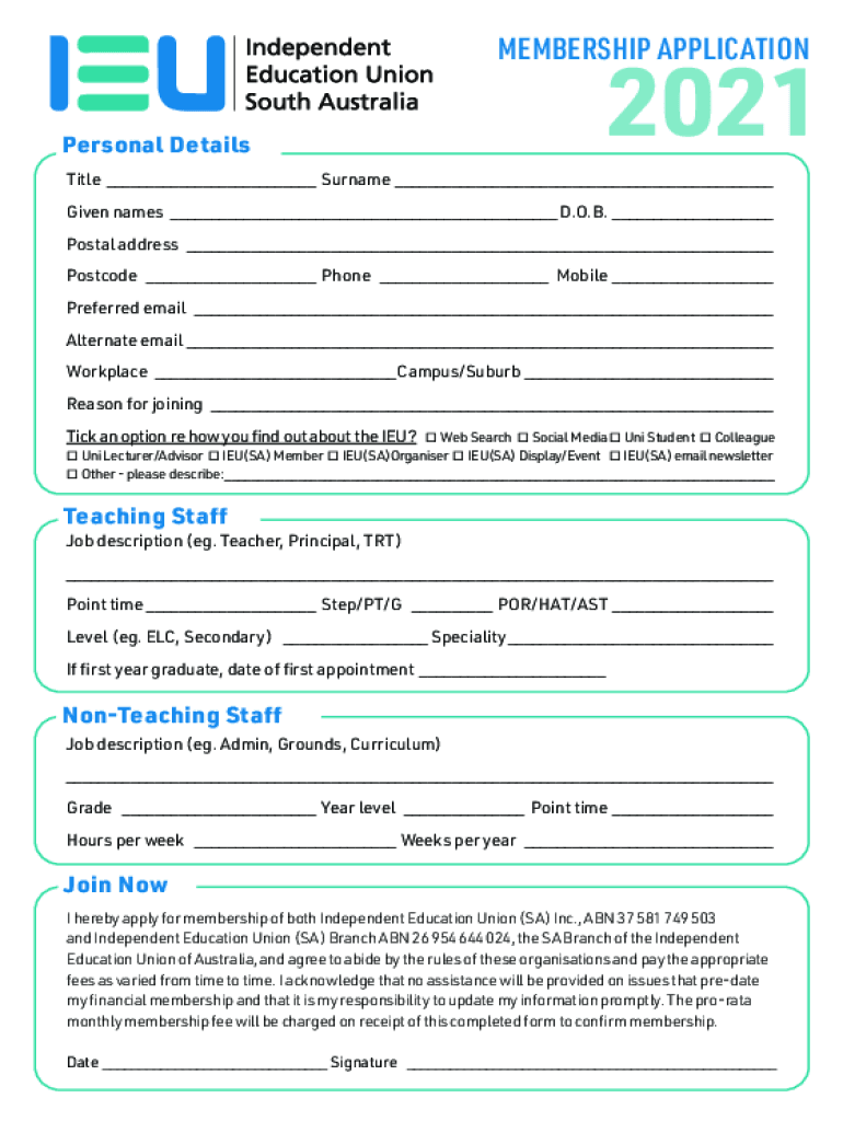 MEMBERSHIP APPLICATION Personal Details2021Title Surname Given names D.O.B. Postal address Postcode Phone Mobile Preferred email Alternate email Workplace Campus/Suburb Reason for joining Tick an