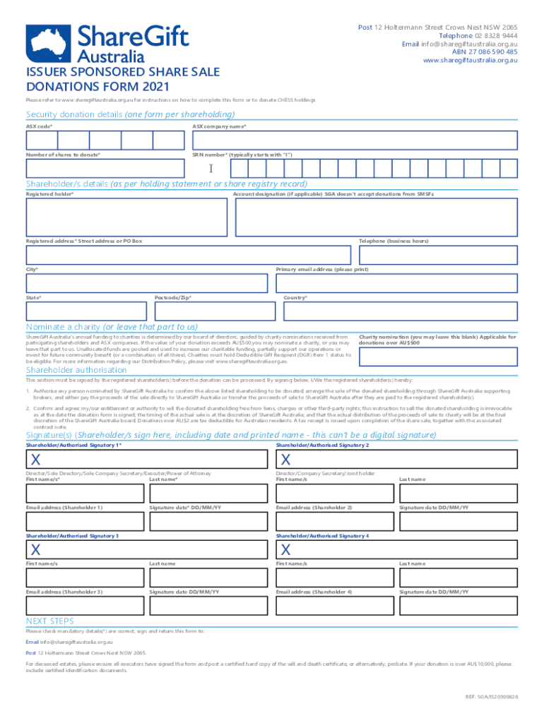 Post 12 Boltzmann Street Crows Nest NSW 2065 Telephone 02 8328 9444 Email info@sharegiftaustralia.org.au ABN 27 086 590 485 www.sharegiftaustralia.org.auISSUER SPONSORED SHARE SALE DONATIONS FORM