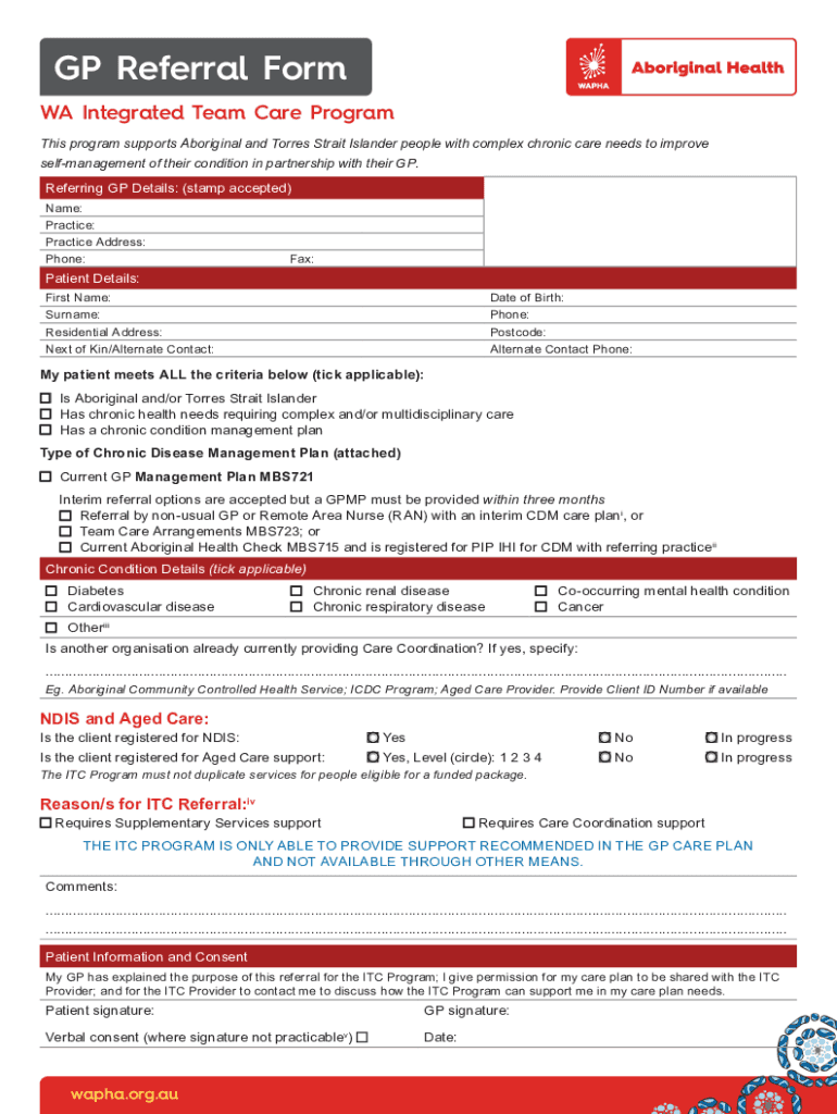 GP Referral Form WA Integrated Team Care Program This program supports Aboriginal and Torres Strait Islander people with complex chronic care needs to improve self-management of their condition in