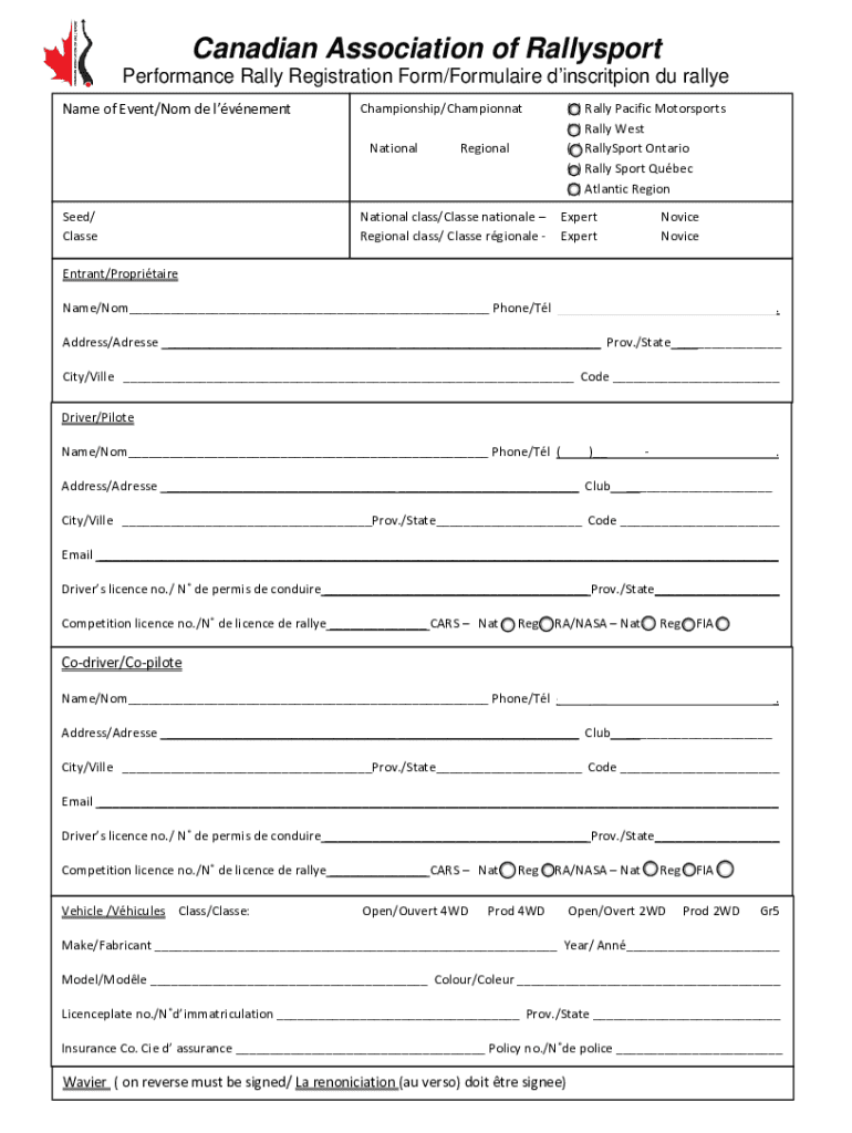 Canadian Association of Rally sport Performance Rally Registration Form/Formula ire inscription Du rally Name of Event/Not de lvnementChampionship/Champion Nationalized/ Class(((((RegionalNational