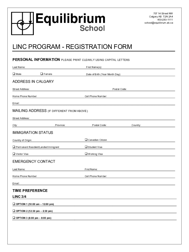 707 14 Street NW Calgary AB T2N 2A4 4032831111 school@equilibrium.ab.caLINC PROGRAM REGISTRATION FORM PERSONAL INFORMATION PLEASE PRINT CLEARLY USING CAPITAL LETTERS Last Name: Malefic Name(s): Revalidate