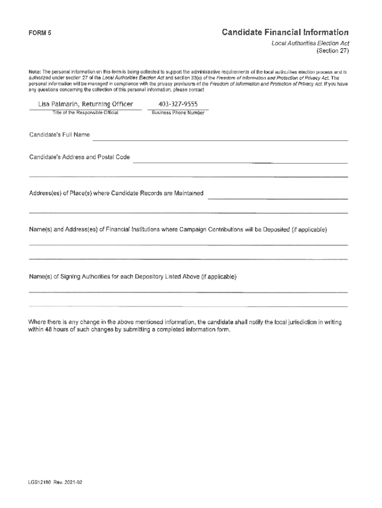 Candidate Financial InformationFORM 5Local Authorities Election Act (Section 27)Note: The personal information on this form is being collected to support the administrative requirements of the local