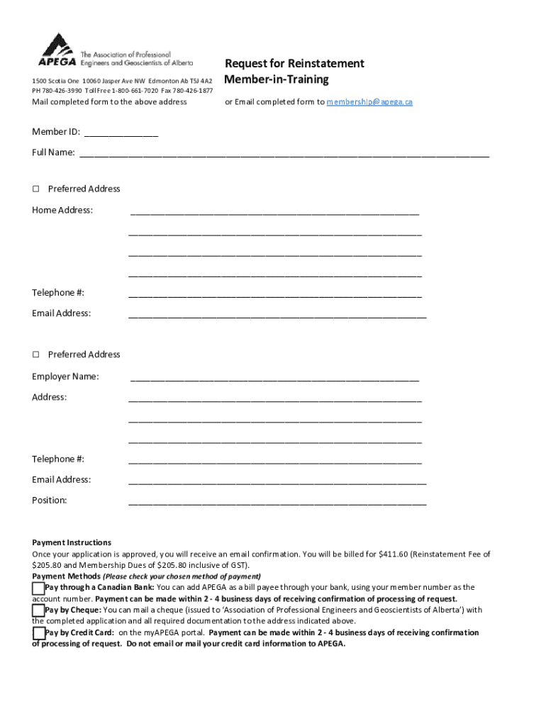 1500 Scotia One 10060 Jasper Ave NW Edmonton Ab T5J 4A2 PH 7804263990 Toll Free 18006617020 Fax 7804261877Mail completed form to the above addressRequest for Reinstatement MemberinTraining or Email