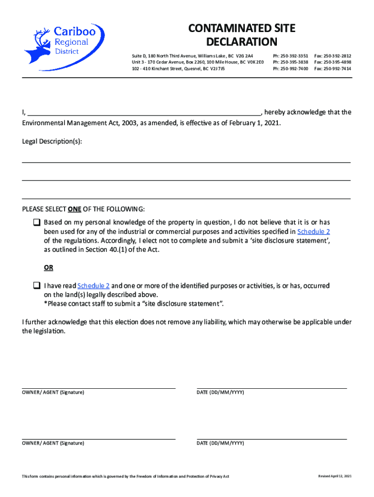 CONTAMINATED SITE DECLARATION Suite D, 180 North Third Avenue, Williams Lake, BC V2G 2A4Unit 3 170 Cedar Avenue, Box 2260, 100 Mile House, BC V0K 2E0102 410 Kin chant Street, Fresnel, BC V2J 7J5Ph: