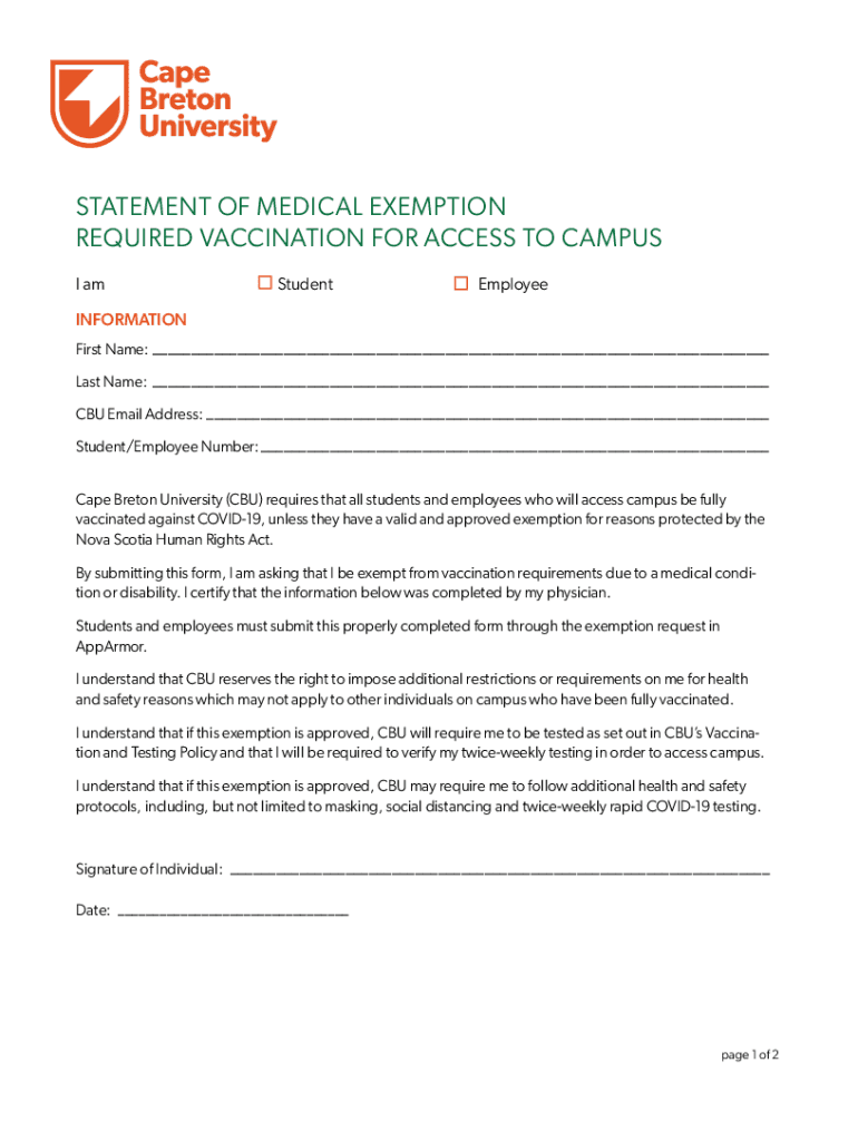 STATEMENT OF MEDICAL EXEMPTION REQUIRED VACCINATION FOR ACCESS TO CAMPUS I amStudentEmployeeINFORMATION First Name: Last Name: CBU Email Address: Student/Employee Number: Cape Breton University (CBU)