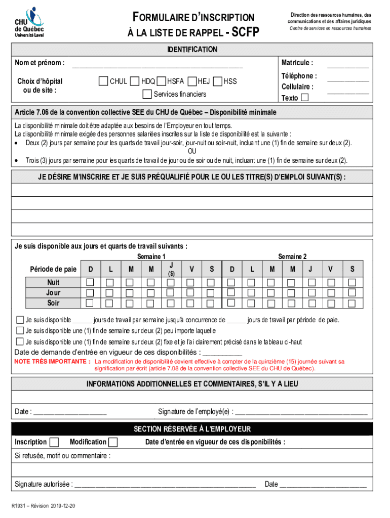 FORMULA IRE INSCRIPTION LA LIST DE RAPPEL SCFPDirection DES resources humans, DES communications et DES affairs critiques Center de services en resources humainesIDENTIFICATION No met prom : Choir