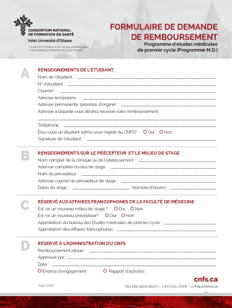 FORMULA IRE DE DEMAND DE REIMBURSEMENT Program études medicals DE premier cycle (Program M.D.) La present initiative a t endue possible grace la contribution financier DE Sent Canada.ARENSEIGNEMENTS