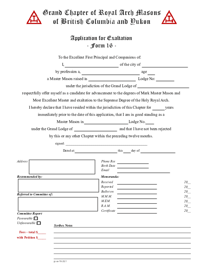 Application for Exaltation Form 16 To the Excellent First Principal and Companions of: I, of the city of by profession a, age Master Mason raised in Lodge No:under the jurisdiction of the Grand Lodge