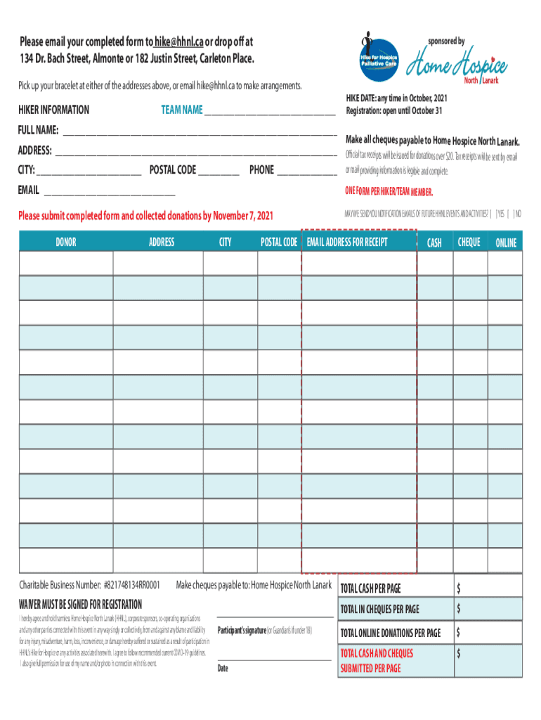 Please email your completed form to hike HNL.ca or drop off at 134 Dr. Bach Street, Almost or 182 Justin Street, Carleton Place. Sponsored pick up your bracelet at either of the addresses above, or