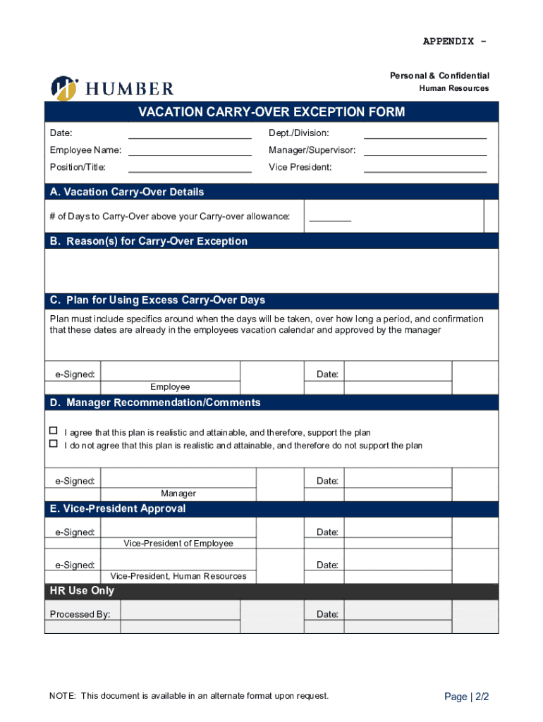 Get the free Vacation Carry-Over Exeption Form - Humber College