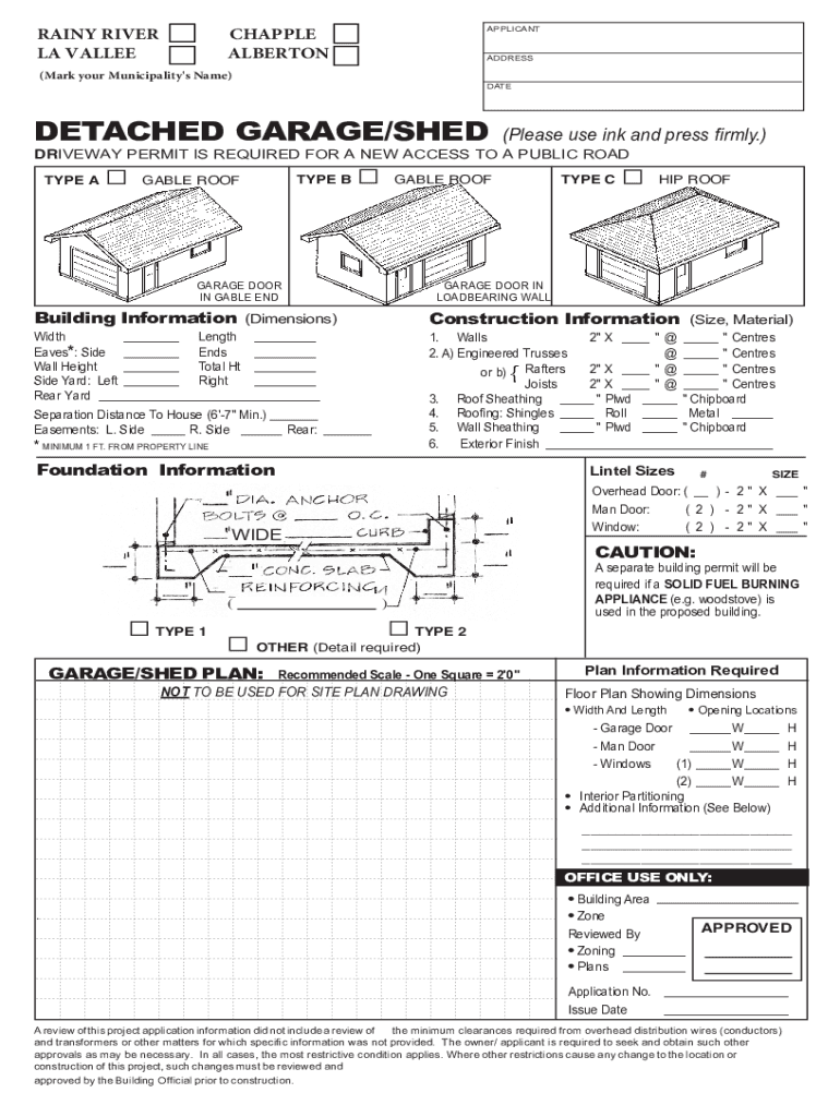 To fill out the detached garageshed form, provide your personal information, the address of the property, a description of the structure, dimensions, and any relevant permits.